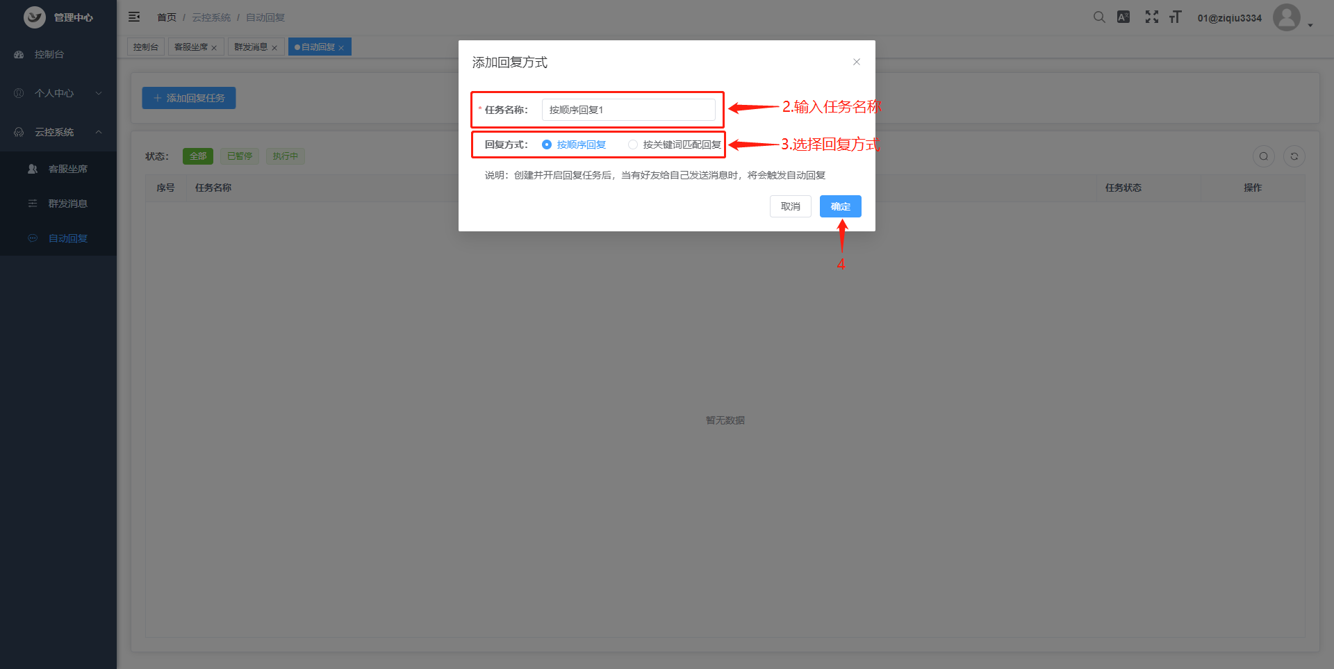 使用步骤:点击“添加回复任务“ > 输入任务名称 > 选择回复方式 > 添加回复内容 > 设置延迟回复时间 > 绑定WS账号 > 点击执行。